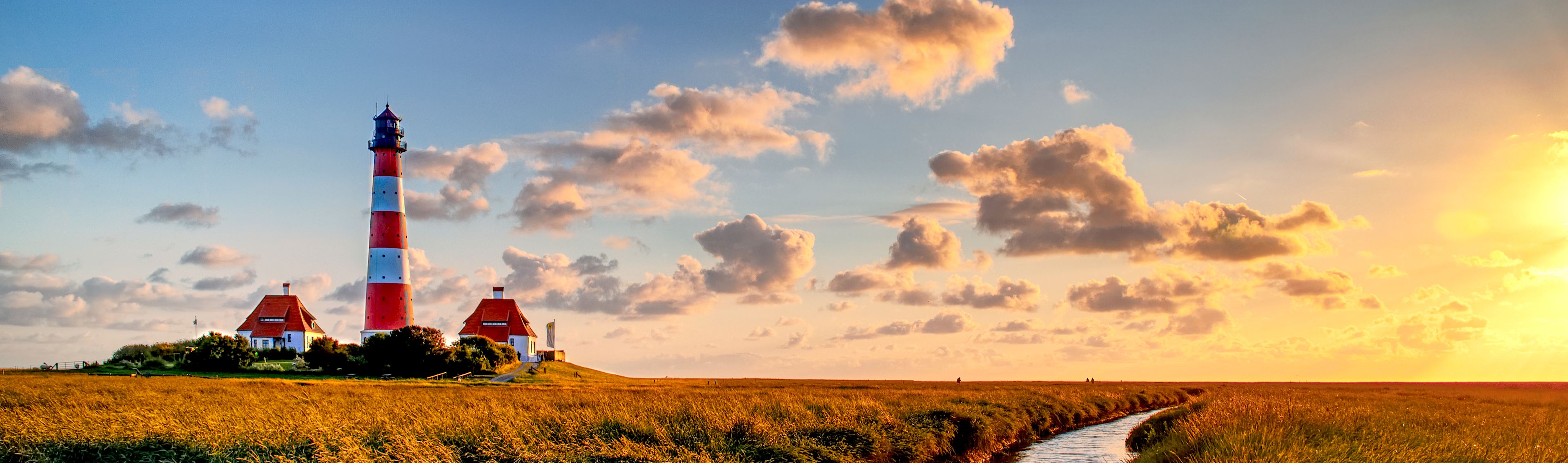 Cette vaste région se compose de zones continentales le long de la côte de la mer du Nord et de différentes îles de la mer du Nord, à savoir Sylt, Föhr, Amrum, Pellworm et Nordstrand, sans oublier les îles Halligen, Hooge et Langeness étant les plus connues. Chacune des îles, tout comme les Halligen, a son propre charme et son propre caractère. Certaines sont reliées au continent par une ligne de chemin de fer ou par un ferry pour voitures ou personnes. Attention! Les Halligen sont interdites aux voitures.