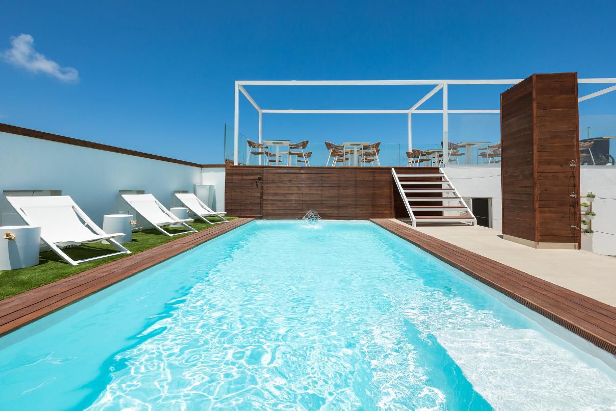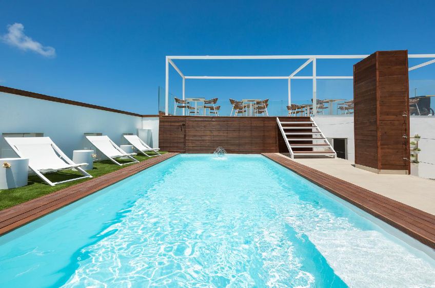 Hall de réception, wifi gratuit. Salle de petit déjeuner. Toit-terrasse avec petite piscine. Chaises longues et parasols gratuits à la piscine.