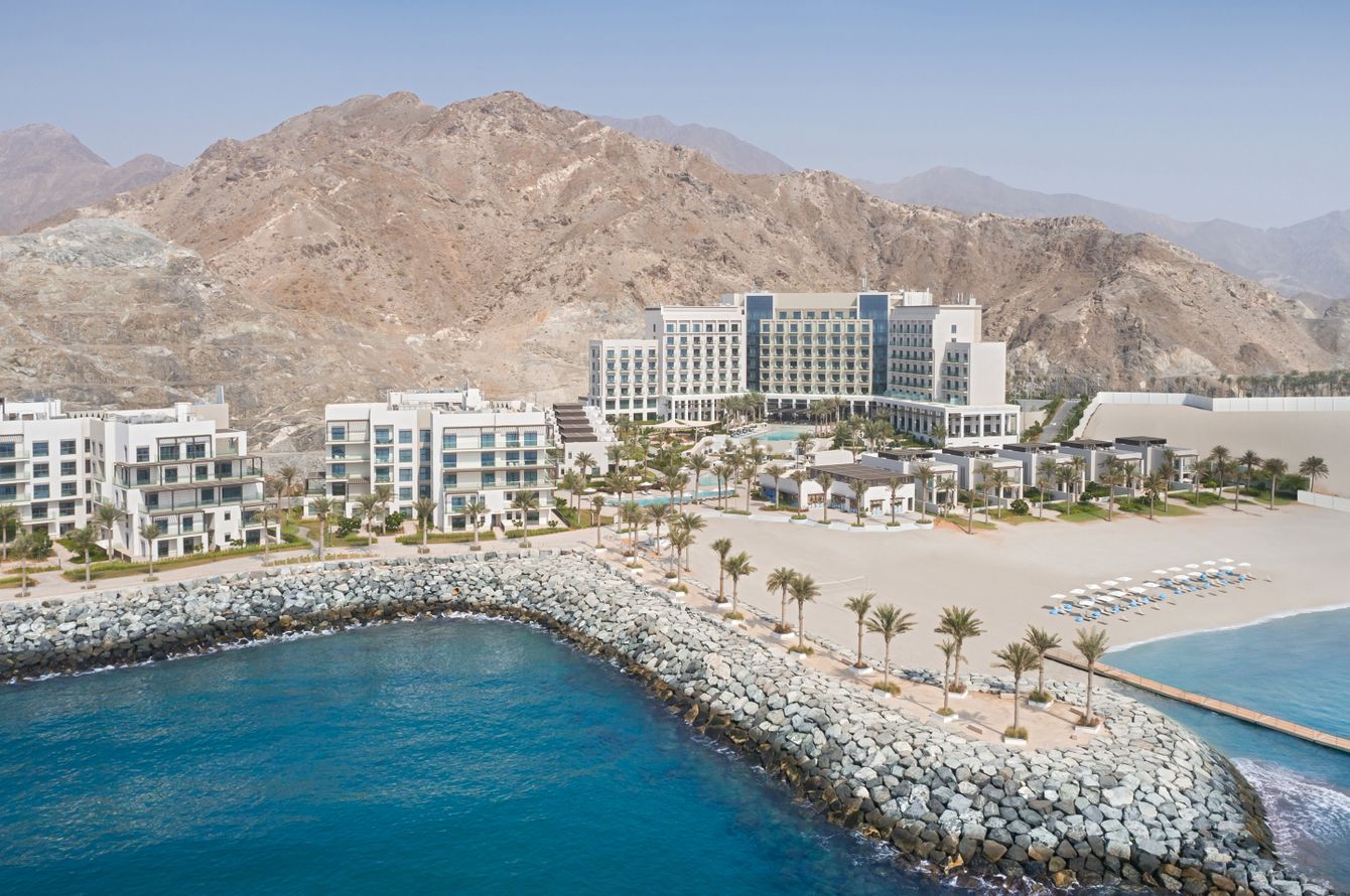 Complexe moderne et luxueux de la chaîne d'hôtels Address, avec vue sur l'océan Indien et les spectaculaires monts Hajar en toile de fond.