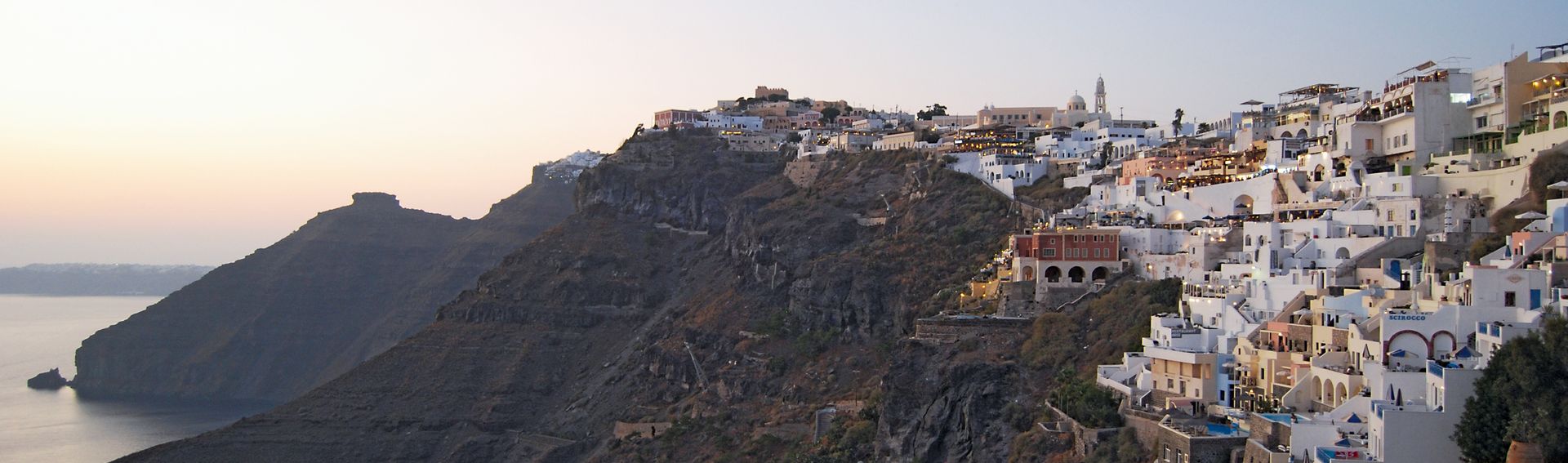 Imerovigli cet endroit pittoresque et tranquille se situe au plus haut point du cratère et offre une vue à couper le souffle et des couchers de soleil magnifiques. Vous y trouverez aussi quelques tavernes et commerces. Firostefani et Fira sont à 20-30 mn de marche par le chemin de crête du cratère.