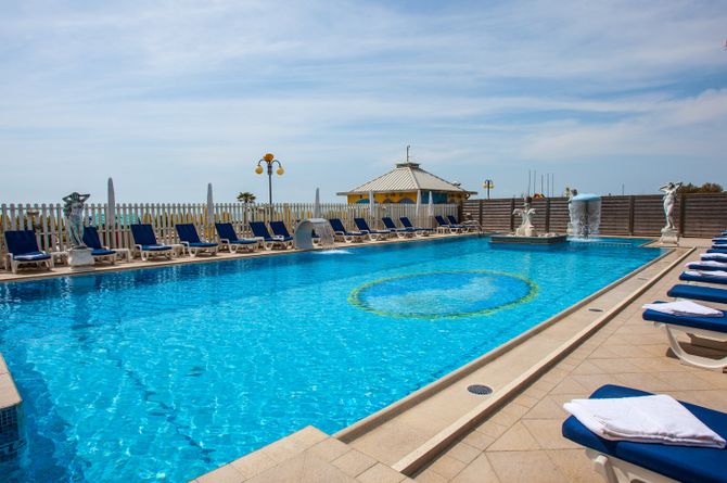Hall de réception avec wifi gratuit. Restaurant avec choix de menu (cuisine italienne). Parking gratuit selon disponibilité. Espace extérieur avec piscine (de mai à septembre) et bain à remous, et piscine d’eau de mer (de mai à septembre), terrasses. Chaises longues et parasols gratuits à la piscine et payants à la plage.