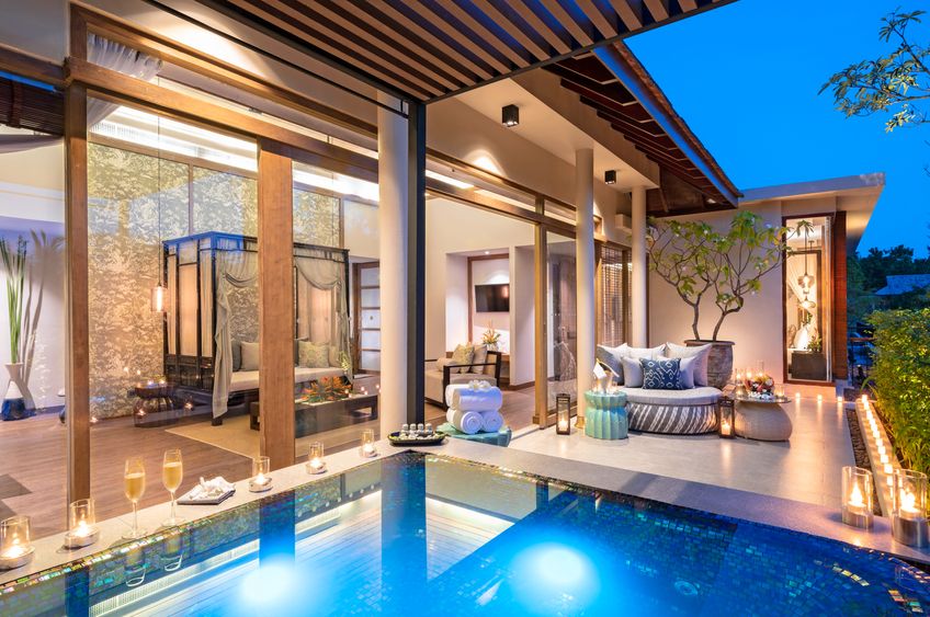 Les résidences et suites élégantes se trouvent dans 7 bâtiments séparés. Les résidences Garden (95 m2) ont chambre avec salon intégré et salle de bain romantique au design d'un jardin intérieur, baignoire en îlot, douche, WC, sèche-cheveux, peignoir, chaussons, téléphone, TV, wifi gratuit, haut-parleurs bluetooth, minibar, bouilloire, machine à expresso, corbeille de fruits quotidienne, coffre-fort, climatisation, terrasse avec jardin. Les résidences Pool (120 m2) ont en sus petite piscine dans le jardin. Situées au premier étage, les vastes suites Jacuzzi Pool (150 m2) ont salon séparé, bain à remous sur la terrasse tropicale et douche extérieure.