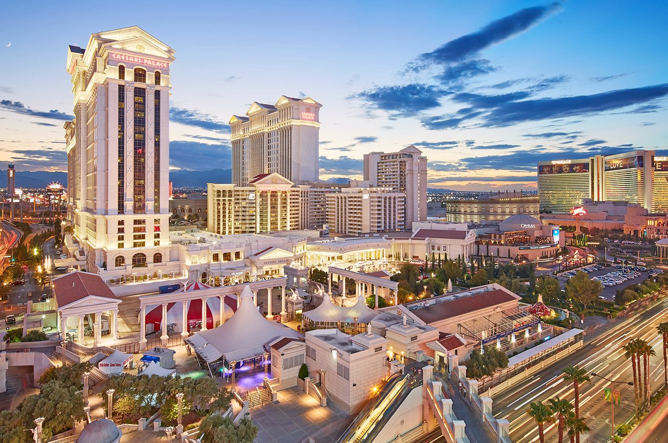 Hall de réception et wifi (payant). 10 bars et lounges, 22 restaurants proposant des spécialités du monde entier, dont un du célèbre chef Gordon Ramsay. Boulangerie, cafés et steakhouses. Galerie marchande «The Forum Shops», avec ses 160 commerces et boutiques, ainsi que les «Appian Way Shops». Grand espace piscine agrémenté de colonnes et de statues romaines et comptant 7 bassins.