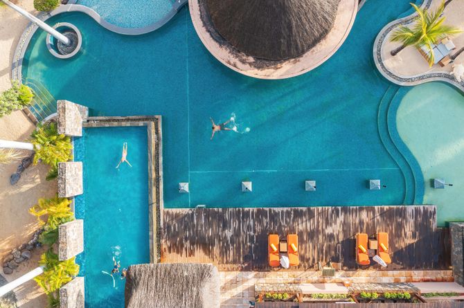 Les suites et villas sont réparties dans des bâtiments de 2 ou 3 niveaux. Les suites Luxury Lagoona (72 m2) ont bain et douche, WC, sèche-cheveux, téléphone, TV, wifi gratuit, machine Nespresso, bouilloire, minibar, coffre-fort, ventilateur, climatisation, balcon ou terrasse. Vue mer latérale sur demande. Max. 2 adultes et 1 enfant. Les suites Luxury Pool (84 m2), au même aménagement que les suites Garden, ont terrasse avec petite piscine privée en plus. Vue mer latérale sur demande. Max. 2 adultes et 1 enfant. Les suites Luxury Pool Oceanfront (125 m2) situées au premier étage ont espace chambre-salon, salle de bain luxueuse, mini hammam et grand balcon avec piscine. Beaucoup d’intimité et vue fantastique sur l’océan Indien. Max. 2 adultes et 1 enfant. Situées au rez-de-chaussée, les suites Luxury Jet Pool Beachfront (180 m2) ont en outre bain à remous privé, mini hammam, piscine à débordement en L et accès direct à la plage de sable fin. Max. 2 adultes et 1 enfant.