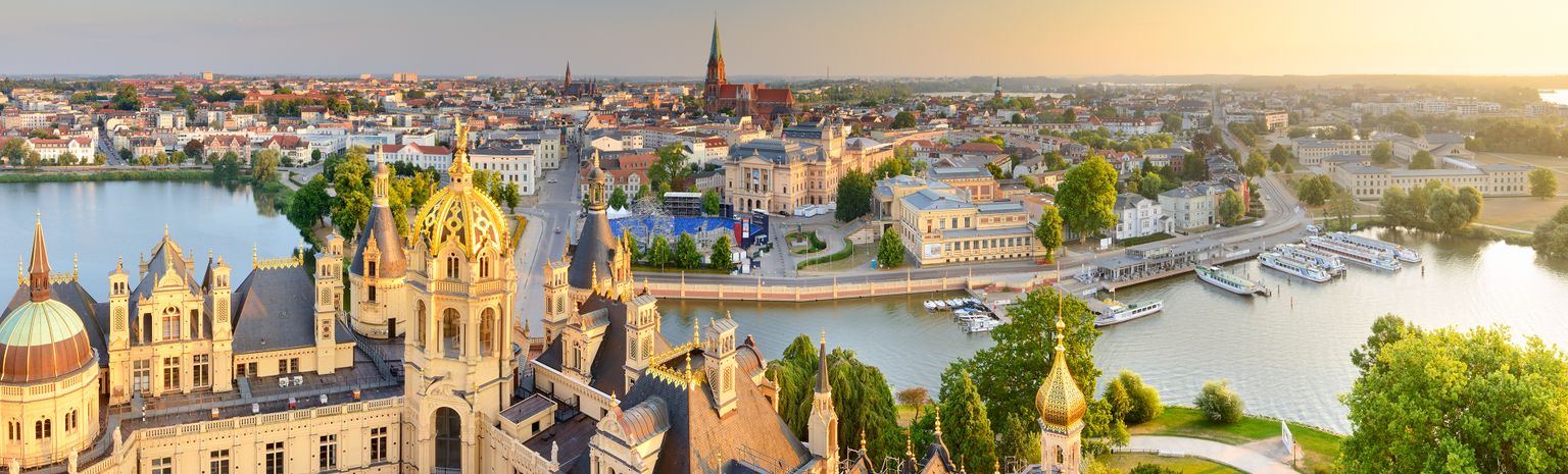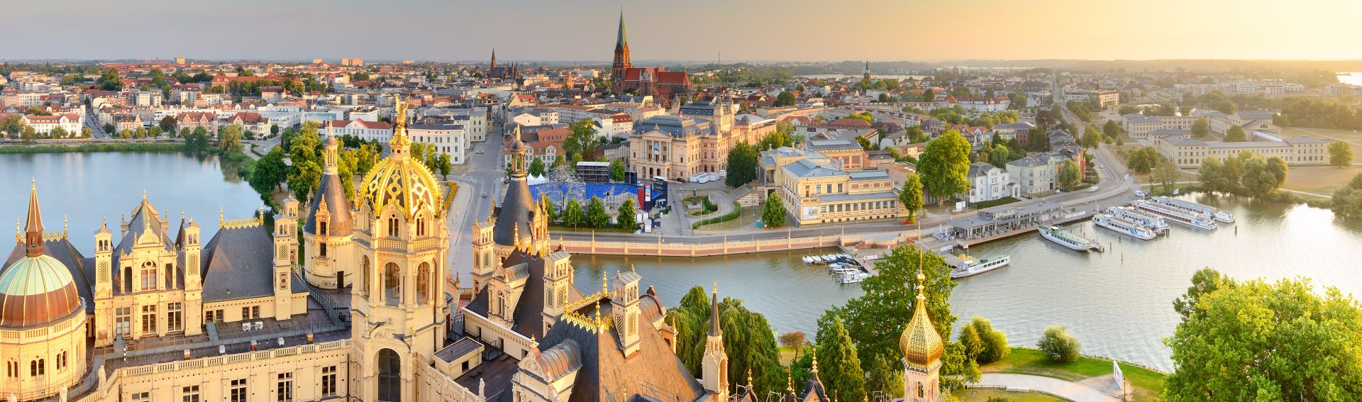 Schwerin se fond dans un paysage lacustre boisé, sur la rive sud-ouest de son lac éponyme. C'est ici, sur une île idyllique, que se trouve le célèbre château de Schwerin, l'un des plus magnifiques édifices du pays, qui a servi de résidence aux grands ducs du Mecklembourg durant des siècles. Le temps d'une promenade dans la vieille ville, le visiteur se verra transporter dans une époque depuis longtemps révolue. La cathédrale datant de la fin du Moyen Âge, les ruelles étroites et les façades à colombages font le charme particulier de la ville.
