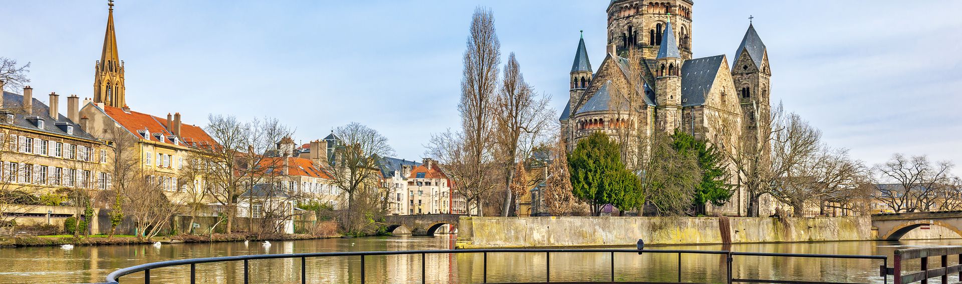 Metz, préfecture du département de la Moselle, est située dans le Nord-Est de la France, à la confluence de la Seille et de la Moselle. Elle n'est qu'à 45 km de la frontière allemande. Toute proche de la triple jonction Allemagne-Belgique-Luxembourg, Metz est une ville qui offre à ses visiteurs une culture entre histoire et modernité, sans oublier des spécialités culinaires à la renommée mondiale. À ne pas manquer: le Centre Pompidou-Metz, pensé comme une dépendance du Centre national d'art et de culture Georges-Pompidou de Paris, une destination culturelle incontournable du Nord-Est de la France. Aujourd'hui très couru, il attire de nombreux amateurs d'art grâce à des expositions aussi bien classiques que contemporaines. Les églises et musées de la ville valent également le détour. À pied ou à vélo, laissez-vous entraîner par les différentes promenades qui sillonnent toute la ville! Elles forment un réseau de 50 km qui vous balade le long de la Seille et de la Moselle, et vous invite à vous poser autour d'un pique-nique. Les multiples parcs de la ville sont des écrins de verdure faits pour se relaxer, comme le parc de la Seille au sud de la ville. C'est dans cet espace consacré aux loisirs que se trouvent le palais des sports des Arènes (salle accueillant aussi bien des événements sportifs que des concerts, du théâtre, du ballet ou du cirque), une piscine couverte et des terrains de football. Puis direction le plan d'eau de l'Île du Saulcy pour une balade en canoë, en Pédalo ou en barque, afin de prolonger encore un peu ce moment de pure détente. De là, la place de la République et ses Galeries Lafayette ne sont qu'à 1 km. Parfait pour le shopping!