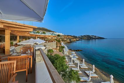 Sur une superficie de 20 000 m2, à flanc de coteau, surplombant la plage de sable privée avec vue mirifique sur la mer et l'île de Delos. À 5 km de la ville de Mykonos avec ses nombreux restaurants, bars, sa vie nocturne animée et son port. À 5 km de l'aéroport de Mykonos.