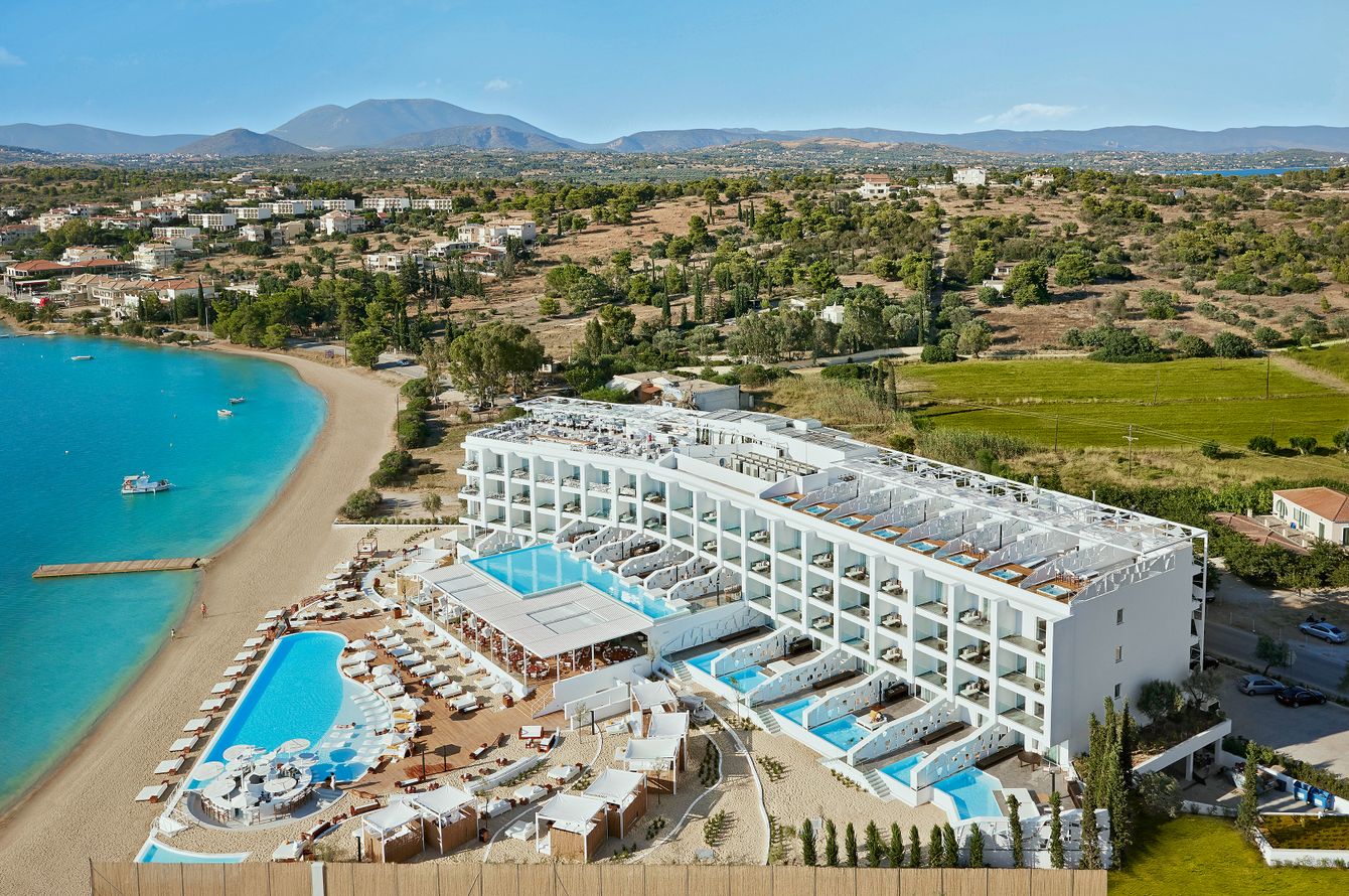 Au bord d'une plage de sable fin en pente douce. À 4 km de la plage de Ververoda, qui servait jadis de repaire de pirates. À 2 km du centre de Porto Heli avec sa vie nocturne animée, ses bars et ses tavernes. À 206 km de l'aéroport d'Athènes.