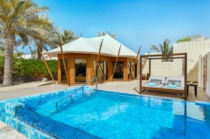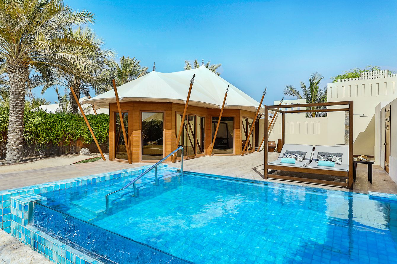 Individuelles, réparties en arc de cercle sur la plage et décorées d’éléments orientaux, les villas Al Bahar Tented Beach Pool (181 m2) ont lit Kingsize, luxueuse salle de bain avec douche à effet pluie, WC, sèche-cheveux, peignoir, chaussons; climatisation, Internet sans fil gratuit, chaîne hi-fi Bose, TV LCD, minibar, bouilloire, coffre-fort, grande terrasse meublée (90 m2) avec piscine privative, douche à effet pluie et baignoire extérieures, cabane de plage privative avec vue golfe Persique. Les villas Al Naseem Tented Beach Pool, aux mêmes dimensions, offrent plus d’intimité et se situent près de la mer.