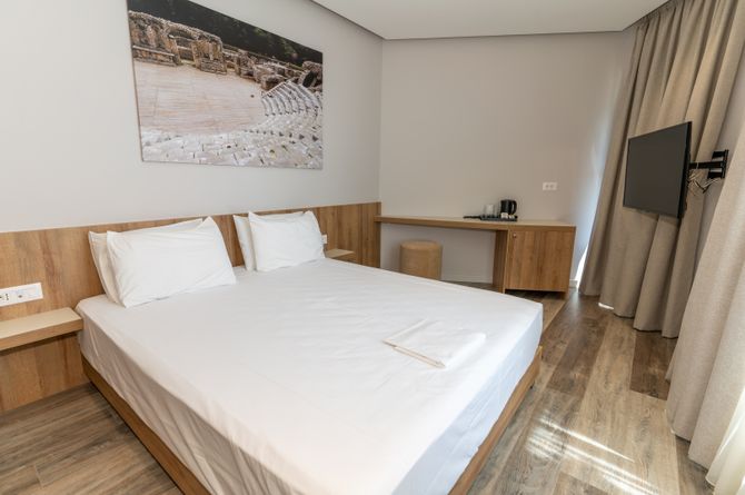 Séparé de la petite plage de gravier par la promenade. Nombreux commerces et restaurants à proximité. À 500 m du port de Saranda. À 20 km du fameux parc national de Butrint. À 35 km de l’aéroport de Corfou, une partie du transfert se fait en bateau. À 275 km de l'aéroport de Tirana.