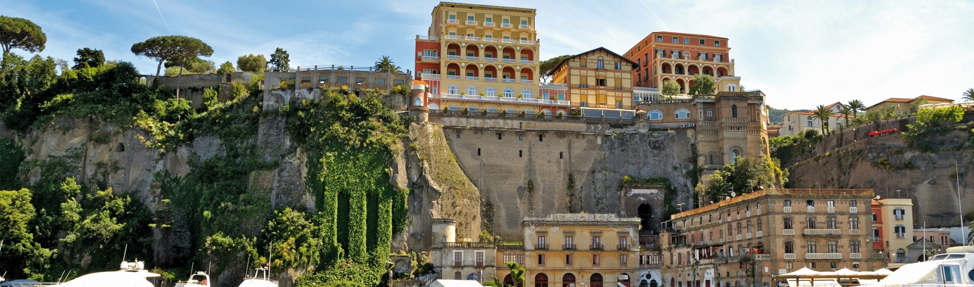 Ceinte par les imposants contreforts d'une montagne calcaire, la ville pittoresque de Sorrente est construite en terrasse sur une falaise escarpée, composées de pierres volcaniques noirâtres. Depuis plus de 2000 ans, les visiteurs des quatre coins du monde affluent pour admirer les couchers de soleil sur la baie de Naples. Au sommet du rocher, on aperçoit le vert intense de la végétation qui se fond harmonieusement avec les couleurs chatoyantes de la ville. Le littoral escarpé de la péninsule de Sorrente, émaillé de petites criques secrètes et de falaises curieuses, dévoile tout son charme; en arrière plan, des villages fascinants aux maisons pastel dessinent les contours de coteaux. Au premier plan, des chalutiers bigarrés s'étendent sur la plage. En soirée, le soleil embrasse peu à peu l'horizon dans un incroyable spectacle de couleurs qui se reflètent dans la mer.