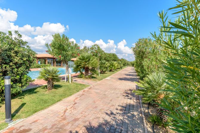 Complexe composé d'un bâtiment principal et de plusieurs bungalows de plain pied dispersés dans le parc. Hall de réception avec wifi gratuit aux espaces communes. Restaurant-buffet principal international, restaurant de plage à la carte servant des spécialités italiennes (de juin à septembre), bar de plage. Au milieu d'un parc bien entretenu avec une végétation tropicale et méditerranéenne luxuriante, agrémenté d’une grande piscine de 2000 m2 avec terrasse et bar attenant. Chaises longues et parasols gratuits à la piscine et à la plage (1 parasol et 2 chaises longues, à partir de la 3e rangée). 1re et 2e rangées contre supplément.
